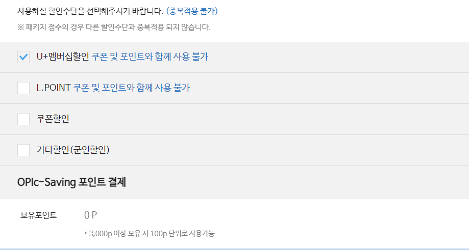 지난번에 오픽 멤버쉽 몰에서 할인을 이미 받았기 때문에, 이번에는 u+통신사 할인을 받았다